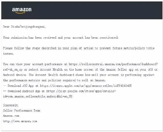 过审的标题通常是:Your selling on Amazon account has been reinstated.